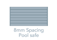 Our Aluminium Slats with 8mm spacings comply with Australian Pool Safety Regulations. *When installed correctly. Always check with your local authority for latest pool safety requirements. (10mm,16mm & 30mm DO NOT comply)